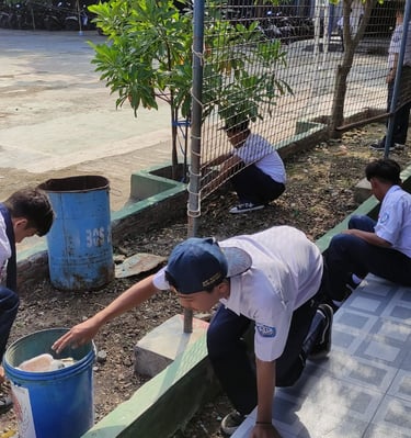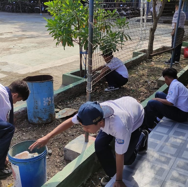 Menanam pohon dan membersihkan area sekolah.